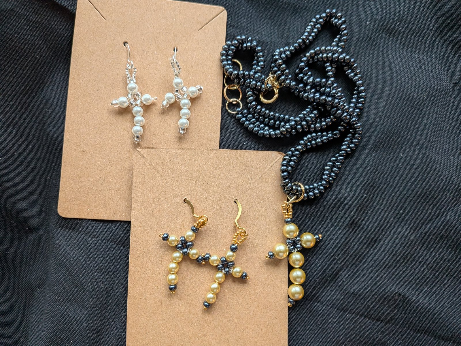 I haven't had any crosses in my inventory, but I saw some on You Tube and made these. They look a little dressy, and aren't your little gold cross, but I like them. I have some earrings and a nice long necklace with black herringbone beads