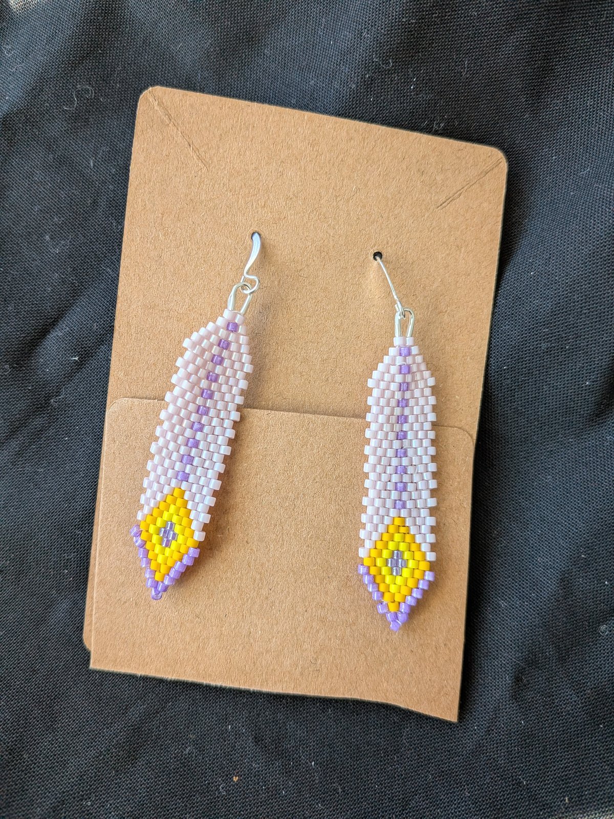 These earrings use one of the first designs I saw when I started beading. I made a bunch when I was new at this, but haven't made any in a while. I like the ability to mix and match colors, so I ended up with this nice purple pair. They're supposed to look like feathers, but I see it as a nice pattern. They're not in the store, but you can email me at Camprobberjam@gmail.com and I'll be glad to quote you a price or make a pair in your favorite colors.