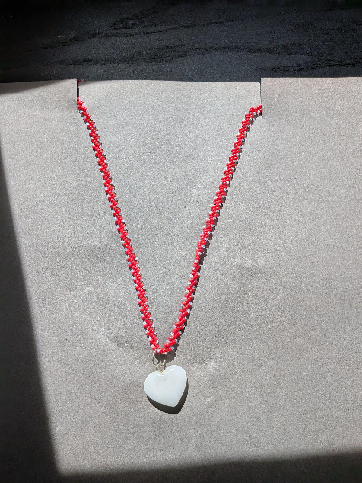 I really enjoy learning new skills. This necklace is made from what’s called ‘St. Petersburg Chain’, which is a new stitch for me. It’s got a great feel, and appears delicate. The heart is jasper. It will be for sale this weekend the Avenue of the Arts in Hudson.