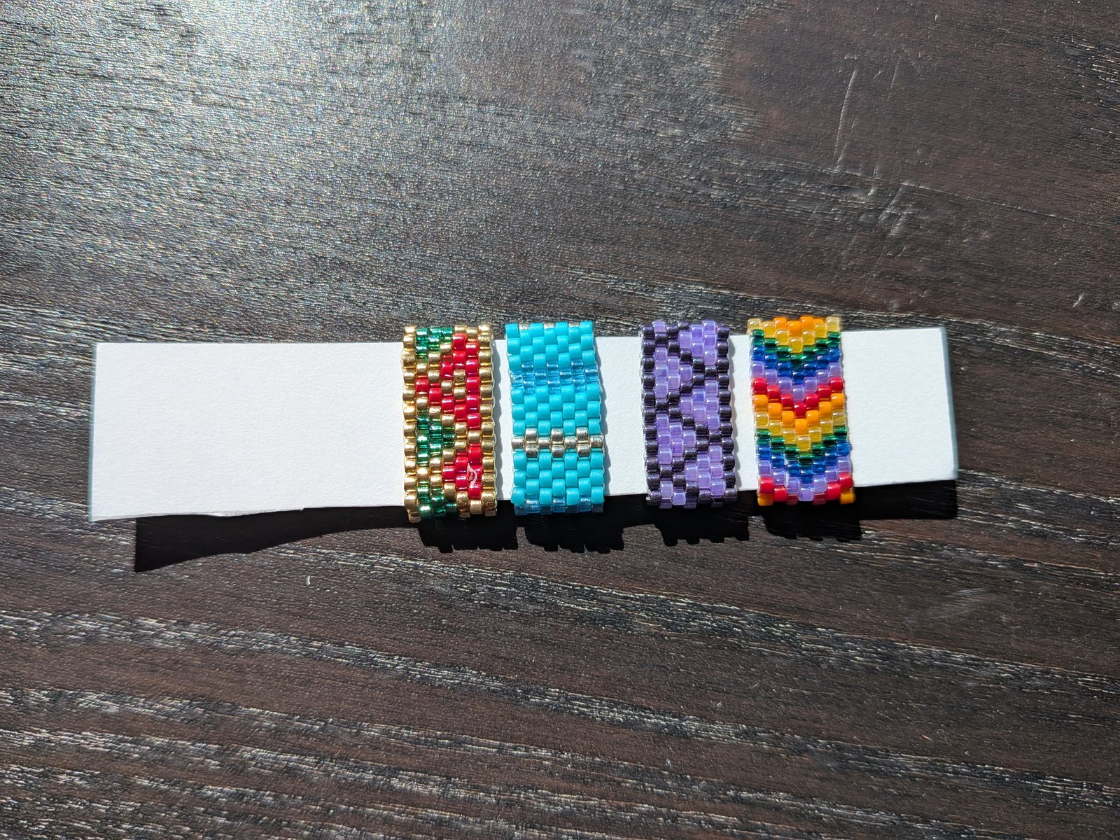 I've been asked to do watch Bands for Apple watches. I'm reluctant because they come in varying sizes and a sample is not likely to be sold. What I have made are these little bands that go around the watch band. I've got them in two sizes, 22mm and 17 mm and several designs and colors.
