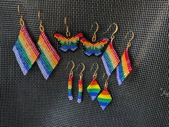 Starting a blog on this website, mostly to promote upcoming shows and discuss bead difficulties. Next Saturday I'll be on the lawn at Oberlin College for Lorain County Pride. I did this show last year and had a great time and have been looking forward to it. Been making rainbow themed stuff all week. The picture is of a bunch of rainbow earrings.