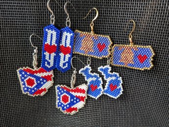 I've been making a few earring with state maps. The photo has four -- Ohio, New York, Pennsylvania, and Michigan. I've got designs for many other states, let me know if you're interested. I'll be across from the Westside Market in Cleveland this Saturday.